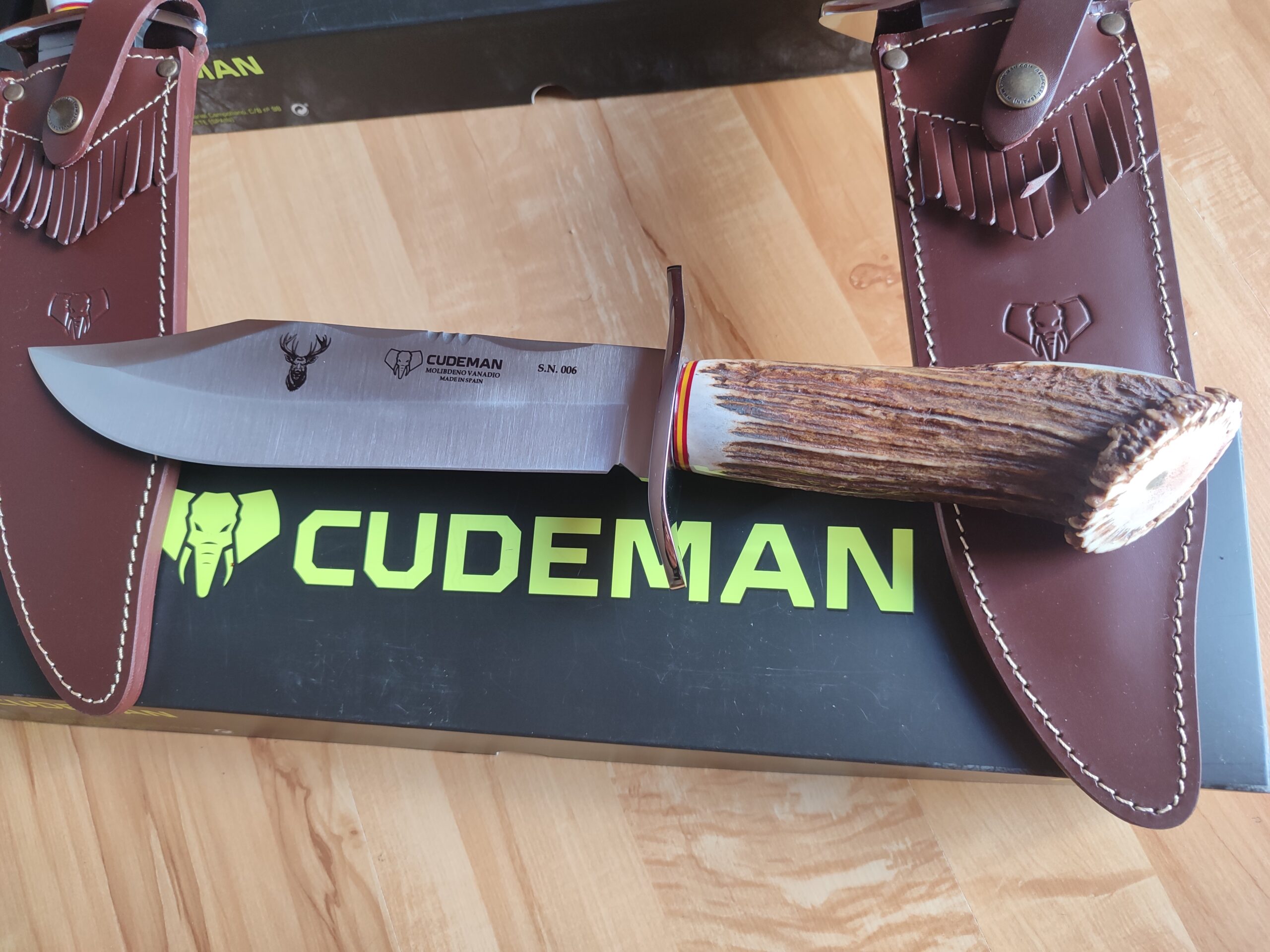 Imponente cuchillo Bowie Cudeman serie numerada y limitada, en Asta selecionada y terminación en Roseta, la terminación en la guarda, lleva la bandera de España.